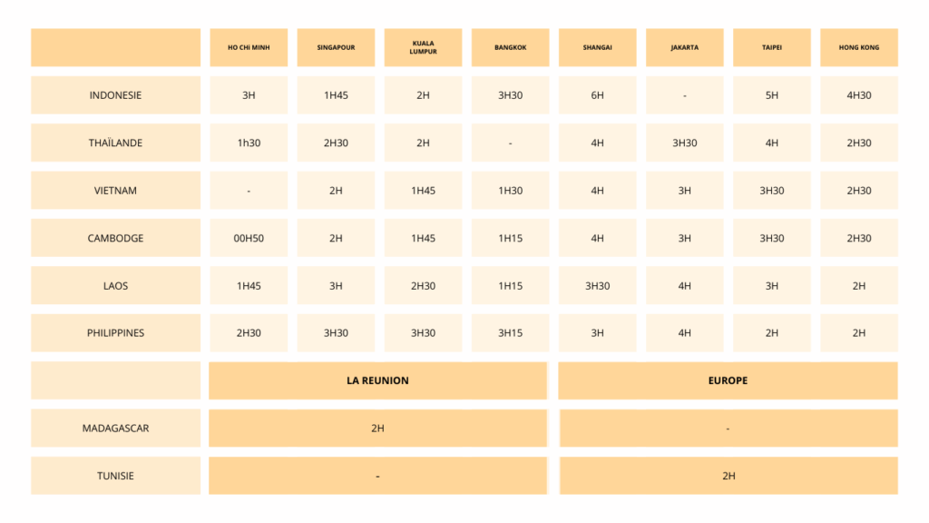 Le réseau de pays que l’on propose est aussi volontairement cohérent avec la réalité des résidents en Asie. L’Indonésie, le Vietnam, le Laos, le Cambodge, la Thaïlande et les Philippines sont naturellement accessibles depuis les grands hubs asiatiques. Madagascar et la Tunisie reposent sur le même principe, en offrant un accès simple à l’Afrique et à la Méditerranée, notamment pour celles et ceux qui souhaitent retrouver une atmosphère francophone ou une proximité culturelle avec l’Europe et les territoires d’outre-mer. Ces destinations permettent de varier les expériences entre plages, jungle, culture, désert, montagnes, villes historiques, plongée, randonnées et rencontres locales.